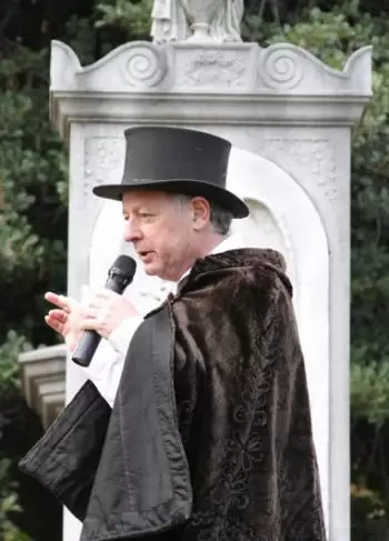 My costume for the tours has been the same for years now: top hat, cape, and a Halloween vest. I dress as a 19th century carriage driver, about to take his tourists across the Green-Wood grounds. In my early days of doing these tours, I used a bull horn that I had purchased at Radio Shack. But, like so many things at Green-Wood, we’ve come a long way with our sound system. We now use a wireless mic and a very good sound system, so people can hear what I’m saying.
