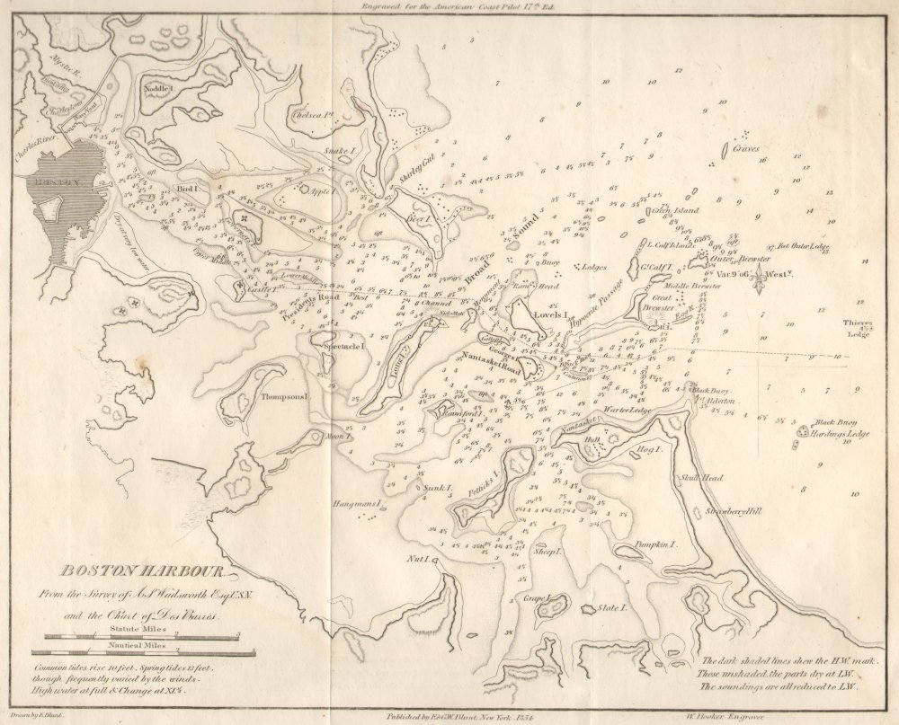 Edmund Blunt was in business with his brother, George William Blunt (1802-1878), who also is interred at Green-Wood. George was born in Newburyport, Massachusetts and also inherited his father’s love of the sea, leaving school at the age at the age of fourteen to work on a ship. After five years he gave up life at sea to marry and settled in New York City, where his brother Edmund ran his nautical publishing house. George worked at updating nautical charts of the Bahama Banks and New York Harbor. In 1833 he was named first assistant of the United States Coast Survey and he held that position until his death. He became the leader of the publishing house and authored many of its books and charts. He wrote Memoir of the Dangers and Ice of the North Atlantic Ocean (1845), The Way to Avoid the Center of Our Violent Gales (1868), and Pilot Laws, Harbor and Quarantine Regulations of New York (1869). The Blunt brothers chart business, which published “charts of all the navigable world,” was substantial. They also sold compasses, sextants, and nautical instruments of all descriptions. Blunt’s books and charts provided the foundation for the United States Hydrographic Office; in 1867, upon his retirement, he sold the copyrights to his Coast Pilot and Practical Navigator, as well as many of the engraved plates for his charts, to the U.S. government, which continued to print them for many years. He was on the board of New York Pilot Commissioners for many years, forwarded complaints to Washington from captains, which led to reform in the lighthouse service, organized the pilot service in New York Harbor, was a harbor commissioner, and was a trustee of the Seaman’s Retreat. He also served as commissioner of immigration, was on the committee which licensed sailors’ boardinghouses, and helped found the U.S. Lighthouse Board and the Union League Club. worked on nautical charts of the Bahama Banks and New York Harbor.