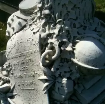 The detailing is exquisite–the musket in the back (carefully attached in several places to prevent its being broken loose from the rest of the monument), the pile of books on the right (not just neatly stacked, but moving back and forth; they were being used to learn, not just an untouched pile of books), the globe, the anchor of hope, the rope tucked underneath the plaque that contains the inscription, the buttons on the uniform, the bark on the tree. This monument is rich with symbolism: the globe and books as exploration and learning, the musket and uniform of a warrior, the anchor of hope, and the broken tree (symbolizing a young life that had been cut short before reaching its full maturity).
