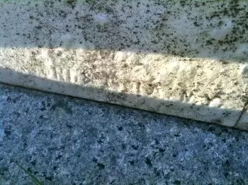 It was readily apparent that this monument had been carved by a very gifted monument maker. So, I started circling it, look for a signature, a mark of pride, that might have been placed somewhere. And, lo and behold, it looked to me like there might be some lettering along the base on the right side. But the sun wasn’t helping–that entire side was in shadow.