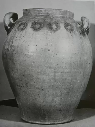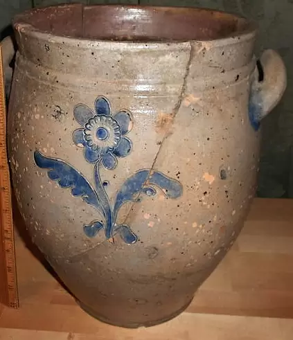 The Crolius Pottery produced stoneware, typically light gray or tan, that was salt-glazed and often decorated with die-stamped and/or incised patterns colored with a cobalt blue glaze.