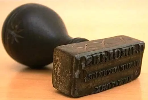 That would be my guess from looking at the photograph–wood with a brass plate stamp. It is at the New-York Historical Society; I visit it whenever I am there, up in the Luce Center. If you call there, they should be able to confirm the materials.