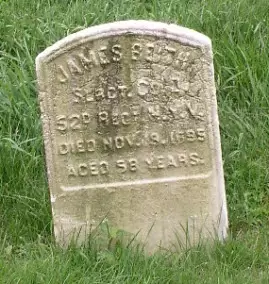 BEITH, JAMES (1837-1895). Sergeant, 52nd Regiment, New York State National Guard, Company D. Originally from Scotland, Beith enlisted as a sergeant and served in the 52nd Regiment’s National Guard for 30 days in 1863. Beith mustered into the G.A.R. in November 1890. He last resided at 124 Adelphi Street in Brooklyn where his cause of death was pneumonia. Section 59, lot 743, grave 62.