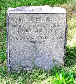 In civilian life, Bennett returned to the piano business and was financed by Cornelius Vanderbilt in manufacturing the first automatic pianos and organs. He also wrote books on land taxation and was a member of the Edwin D. Morgan Post #307 of the G.A.R. His last address was 161 West 108th Street in Manhattan, where he died of senility at age 85. Section 152, lot 19006.