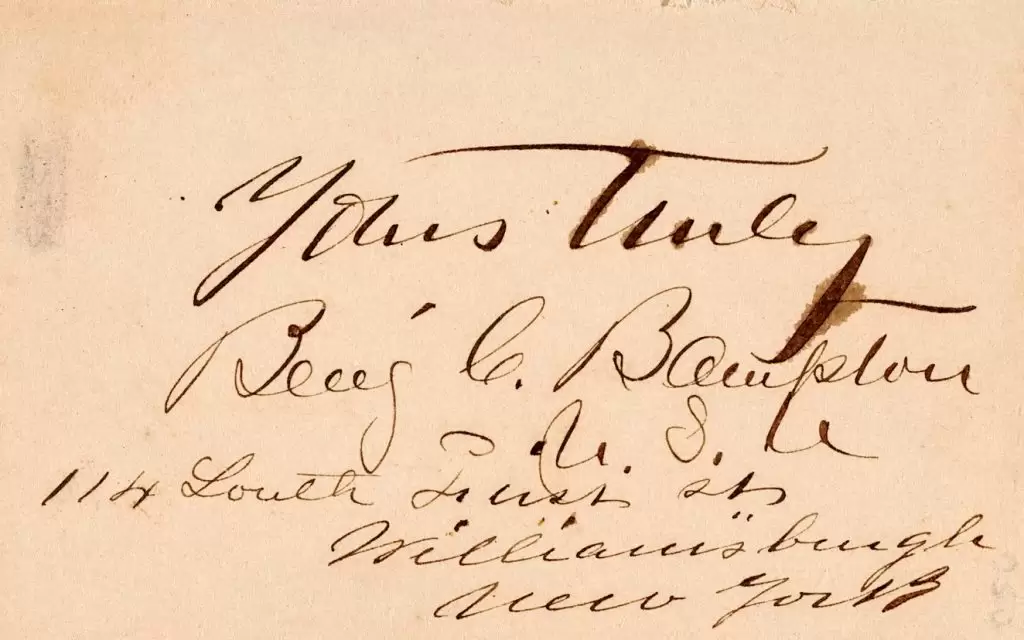 Bampton was listed as an engineer in the 1864, 1865, and 1866 Brooklyn Directories. At the time of his retirement from the Navy on September 6, 1873, with the rank of chief engineer, he had served ten years and eight months at sea. Subsequently, Bampton became the constructing engineer of the Pacific Mail Steamship Company, a position he held for 16 years. Bampton was listed as an engineer in the Brooklyn Directories for 1873-1875 and 1880-1882. The Veterans Schedule of 1890, which confirms his Civil War service, reports that he served on the USS Iroquois. He belonged to the Freemasons, the Brooklyn Masonic Veterans’ Association, and the Military Order of the Loyal Legion. He last lived at 313 Adelphi Street in Brooklyn where his funeral was held under Masonic auspices. Section 156, lot 23325.