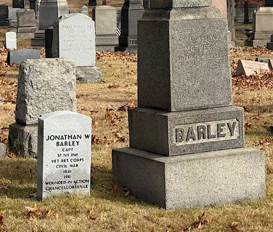 Barley continued his service when he was appointed to the Veteran Reserve Corps on December 8, 1863. Initially serving as captain of the 10th Regiment, he was transferred to the 159th Company, Second Battalion, on August 1, 1864, assigned to the 5th Independent Company on December 23, 1865, and discharged on August 20, 1866. His application for an invalid pension was granted under certificate 77,596. His last residence was 917 St. Marks Place in Brooklyn. He died from cancer. In 1911, Elizabeth Barley, applied for a widow’s pension, application 976,227. Section 146, lot 22276.
