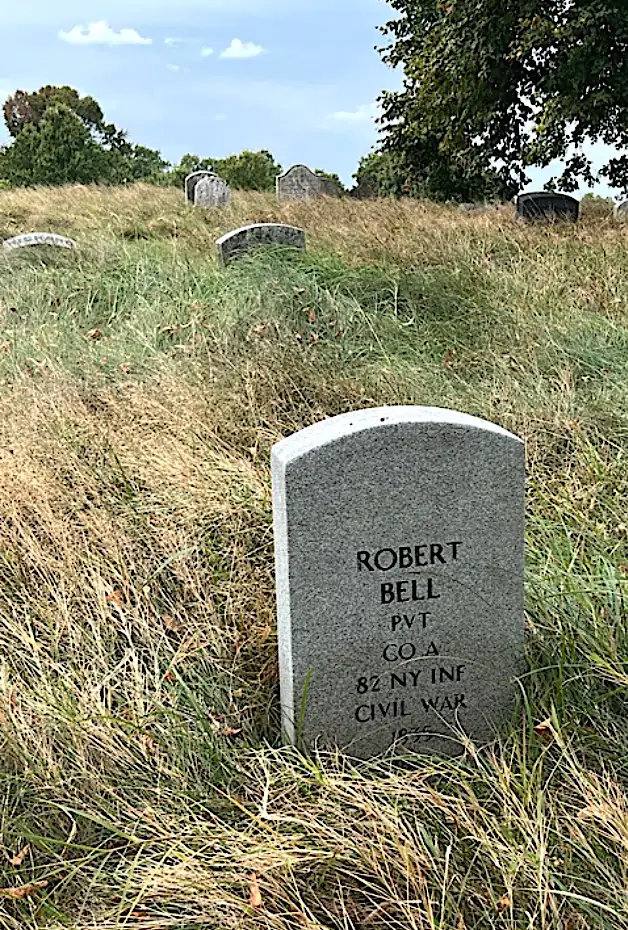 BELL, ROBERT (1835-1861). Private, 82nd New York Infantry, Company A. Of Irish birth, he enlisted at New York City on May 21, 1861, and mustered in that day. On November 17, 1861, he died of intermittent fever at Poolesville, Maryland, and was interred three days later. Section A, lot 9146, grave 163.