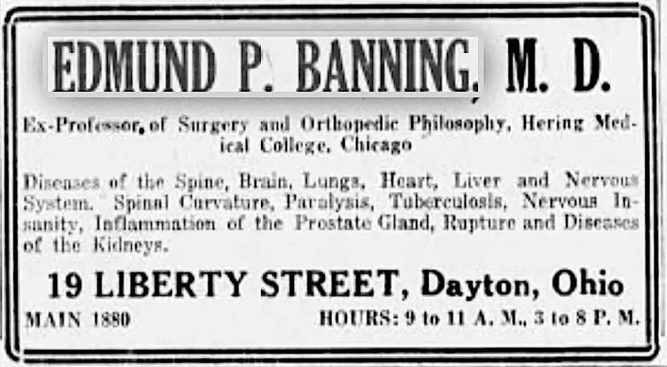 After the Civil War, he followed in his father’s footsteps, choosing to be a physician, and attended the Cleveland University of Medicine and Surgery and the Cleveland Homeopathic Medical College. He later lectured on orthopedics at the Herring Medical College at Fort Wayne, Indiana. Banning married four times. His first two wives died; his third wife, Carrie (Carina) Carpenter, whom he married on February 11, 1879, in Geneva, New York, was a 1877 graduate of the University of Wisconsin and subsequently graduated from the Cleveland University of Medicine and Surgery. She opened a medical practice in Fort Wayne in 1898. The couple had five children and divorced on an unknown date.