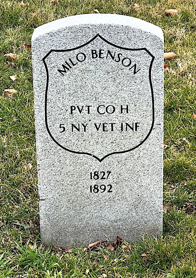 BENSON, MILO (1827-1892). Private, 5th New York Veteran Infantry, Company H. Born in Massachusetts, Benson enlisted as a private on February 23, 1865, at New York City, mustered into the 5th Veterans that day, and mustered out on August 21 at Hart’s Island, New York Harbor. In 1890, his application for an invalid pension was granted, certificate 634,939. He last lived at 62 Garden Street in Hoboken, New Jersey. His wife, Helen Benson, who is interred with him, applied for and received a widow’s pension in 1892, certificate 353,655. Section 200, lot 26925.