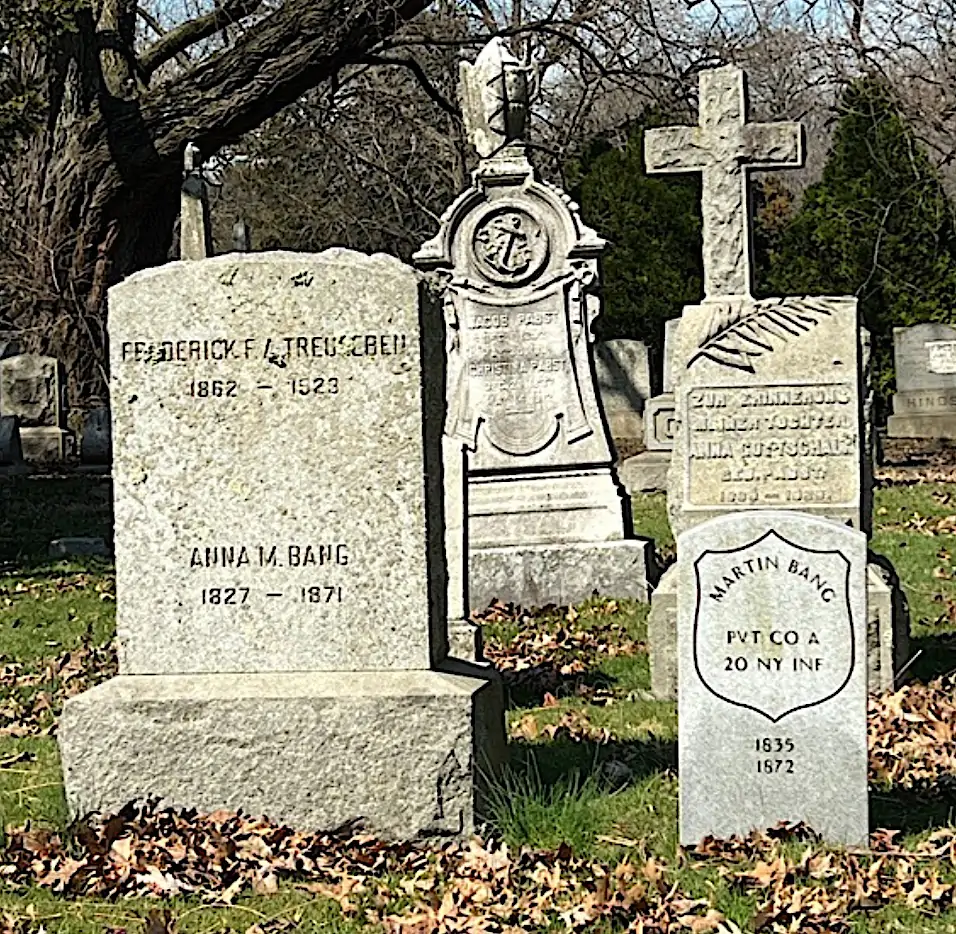 BANG, MARTIN (1835-1872). Private, 20th New York Infantry, Company A. Bang, who was born in Germany, enlisted on May 10, 1861, at New York City, as a private, and mustered into his company the same day. He mustered out on June 1, 1863, at New York City. His last residence was on Hudson Street in Manhattan. Section 165, lot 16943.