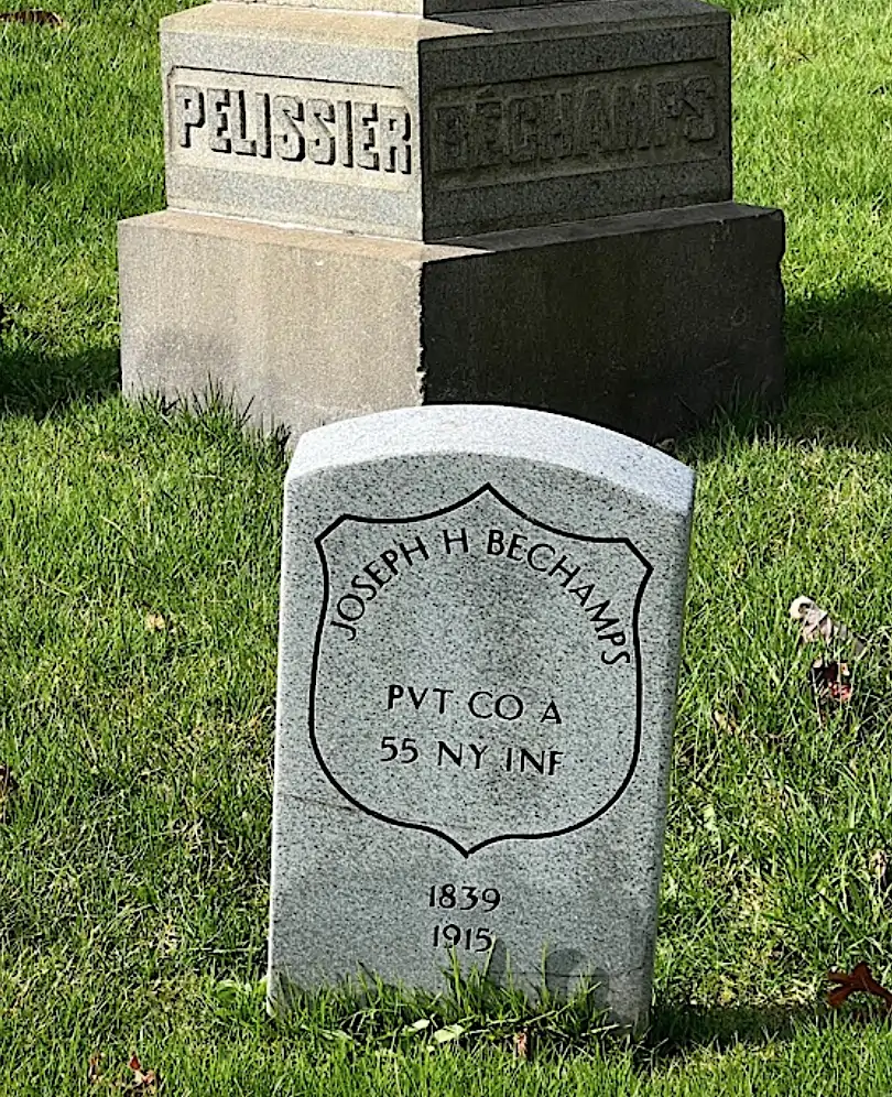 Although some records indicate that Bell deserted on July 22, 1865, that appears to be incorrect: he applied for and was granted an invalid pension in 1890, certificate 751,903. In civilian life, he was employed as a marble-polisher according to the 1880 census. Bell last lived at 259 Third Avenue in Brooklyn. His death was attributed to tuberculosis. Bridget Bell, who is interred with him, applied for and received a widow’s pension in 1898, certificate 489,962. Section 135, lot 27263, grave 838.