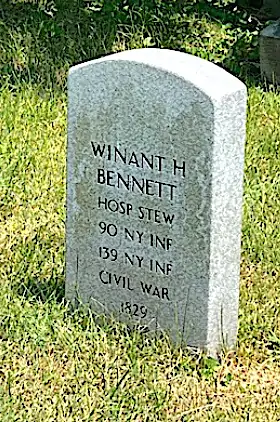 BENNETT, WINANT (or WYNANT) H. (1829-1901). Hospital steward, 90th New York Infantry, Companies F and K; private, 139th New York Infantry, Company G; 5th New York Cavalry, Company F. After enlisting as a private at his hometown, Brooklyn, on October 24, 1861, he immediately mustered into Company F of the 90th New York, and was transferred to Company K at some point. On November 21, 1861, he was promoted to hospital steward and joined the regiment’s Field and Staff. Bennett was discharged for disability on June 16, 1862, at Key West, Florida. Shortly thereafter he enlisted at Brooklyn as a private on August 22, 1862, and mustered into the 139th New York on September 9, and was discharged before he re-enlisted a month later as a private at New York City on October 18, mustered immediately into the 5th New York Cavalry, and mustered out on July 19, 1865, at Winchester, Virginia.