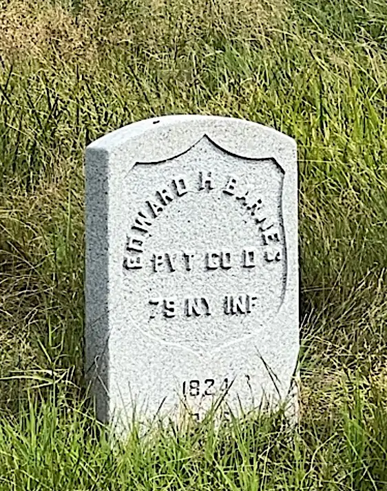 BAKER, EDWARD E. (1837-1888). Private, 13th Regiment, New York State National Guard, Company G. Born in Peekskill, New York, he enlisted at Brooklyn on May 28, 1862, mustered into the 13th New York, served three months, and mustered out at Brooklyn on September 12. He last resided at 119 West 130th Street in Manhattan. His death was attributed to pneumonia. Section 186, lot 18432.