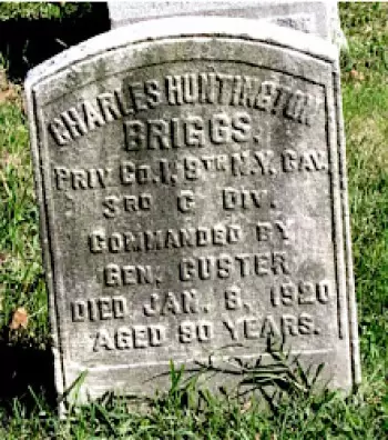 BRIGGS, CHARLES HUNTINGTON (1840-1920). Private, 8th New York Cavalry, Companies I and E. Briggs, a New Hampshire native, enlisted at Edmeston, New York, and mustered into Company I of the 8th New York Cavalry on August 9, 1864. He was transferred intra-regimentally to Company E on November 1, 1864, and mustered out on June 27, 1865, at Alexandria, Virginia. It appears that he also served in the 2nd U.S. Cavalry after the War; pension index cards note his service in that unit, and his gravestone notes that he was commanded by General George Armstrong Custer.