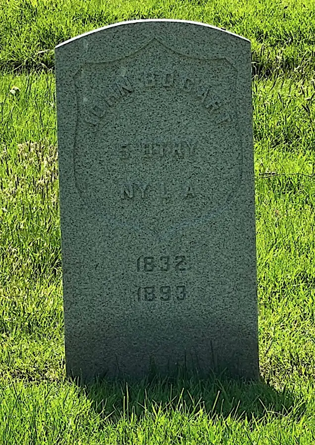 BOGART, JOHN (1832-1893). Private, 5th Independent Battery, New York Light Artillery. A Brooklynite by birth, Bogart enlisted there as a private on November 10, 1862, and mustered that day into the New York Light Artillery. He mustered out on July 6, 1865, at Hart’s Island in New York Harbor. Although he applied for an invalid pension in 1889, application 726,129, it was never certified. He last lived on Fulton Street in Brooklyn. His wife applied for and received a widow’s pension, certificate 398,011. Section 15, lot 7890, grave 5.