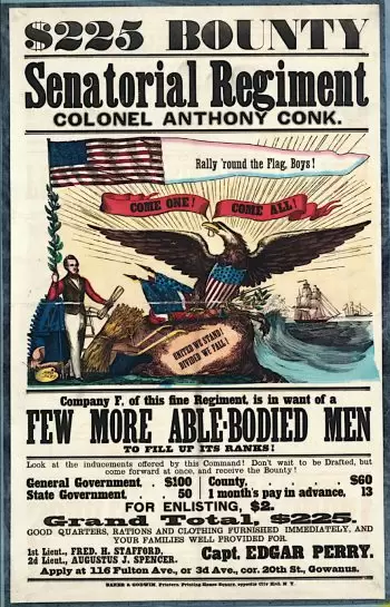 CONK, ANTHONY (1822-1894). Colonel, 139th New York Infantry. Conk was born in New Jersey. He is listed as a carpenter in the Brooklyn Directories for 1858 and 1862. During the Civil War, he organized and led the 139th New York Volunteers, which a local newspaper called “one of the most distinctively Brooklyn regiments.” Posters seeking recruits for the regiment, known familiarly as the Senatorial Regiment, offered new recruits a bounty of $225, of which $150 was payable before leaving the State and $75 upon discharge; good quarters and rations were also promised. As per his muster roll, he was a carpenter by trade who was 5′ 10½” with dark brown hair and gray eyes. He enlisted at Brooklyn on July 28, 1862, served with the 139th until July 29, 1863, when he resigned on account of pressing personal business. The Brooklyn Directory for 1863 lists him as a builder.