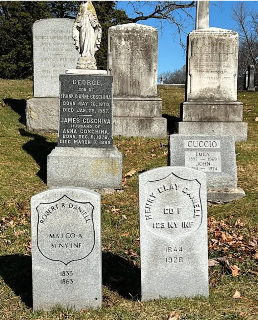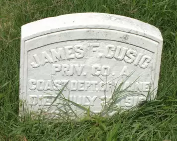 Remaining interested in military affairs, Cusic was active in the Abel Smith Post #435 of the G.A.R. The 1882-1883 Brooklyn Directory identifies him as a painter; during those years, he lived at 11 Fleet Place. In 1892, he applied for and was granted an invalid pension, certificate 948,483. According to the censuses of 1900 and 1910, he was living in Brooklyn where he was a laborer at the Navy Yard. Cusic’s obituary in the Brooklyn Standard Union confirms his Civil War service. His last residence was 1450 36th Street in Brooklyn. He died from pneumonia. In 1918, Henrietta Cusic, who is interred with him, applied for and received a widow’s pension, certificate 864,970. In addition to his widow, he was survived by two daughters and four sons. Section 166, lot 25685.