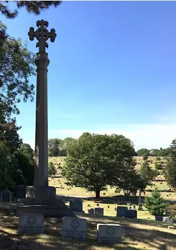 An article in the Brooklyn Daily Eagle on December 18, 1906, stated that his wife unveiled a beautiful 20′ monument topped by a Celtic-style cross, in tribute to him, made by Tiffany Studios from granite in the style of those in English churchyards (below). One of the inscriptions on the monument read, “Lord, thou hast been our refuge from one generation to another.” Section 125, lot 31938, grave 25.