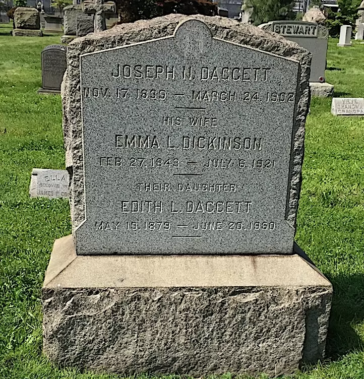As per an article about his death in The New York Times on March 27, 1902, Daggett was the superintendent of the New York store of retailer John Wanamaker. That store’s employees adopted resolutions of appreciation attesting to his abilities as a skillful executive and sympathetic friend, free of malice, who demonstrated kindness to all employees in the company. Among the tributes was the acknowledgement that “he was a lovable man, helpful and kindly, whose character and daily walk endeared him to all with whom he came in contact.” Another of the resolutions, which was included in his obituary in the New York Herald read, “It mattered not what duties taxed his physical and emotional strength, his time was always given, his ear always open, when he was appealed to even by the humblest.” His death was also announced in the Brooklyn Daily Eagle and the New York Tribune, which also quoted from the resolutions of condolence. Daggett worked for the John Wanamaker store for eighteen years in both the Philadelphia, Pennsylvania, and New York City establishments. He last lived at 170 Washington Park in Brooklyn. His death was attributed to heart disease. Philadelphia newspapers were asked to print notices of his death. Shortly after his death in 1902, Emma Dickinson Daggett applied for and received a widow’s pension, certificate 705,412. He was also survived by two children. Section 205, lot 31066, grave 1.