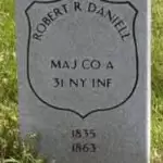 DANIELL (or DANIEL), ROBERT RAVEN (1835-1863). Major, 31st New York Infantry, Company A. Born in New Orleans, Louisiana, he enlisted at New York City as a second lieutenant on May 2, 1861, and was commissioned into the 31st New York’s Company A on May 24. Daniell was complimented by Colonel Calvin Pratt in his field report from Alexandria, Virginia, on July 22, 1861, for his “coolness and judgment.” He rose to first lieutenant on October 6, 1861, to captain on March 21, 1862, and then to major on October 4, 1862, the same day that he was transferred to the Field and Staff. While on a leave of absence in New York City, he succumbed to typhoid fever on April 13, 1863. He last lived at 205 Schermerhorn Street in Brooklyn. He was survived by his widow, Jane Shaw Daniell, whom he married in 1862, an infant daughter; his brother, Henry Clay Daniell (see), who is buried in the same lot, also served in the Civil War. Section 112, lot 14224.