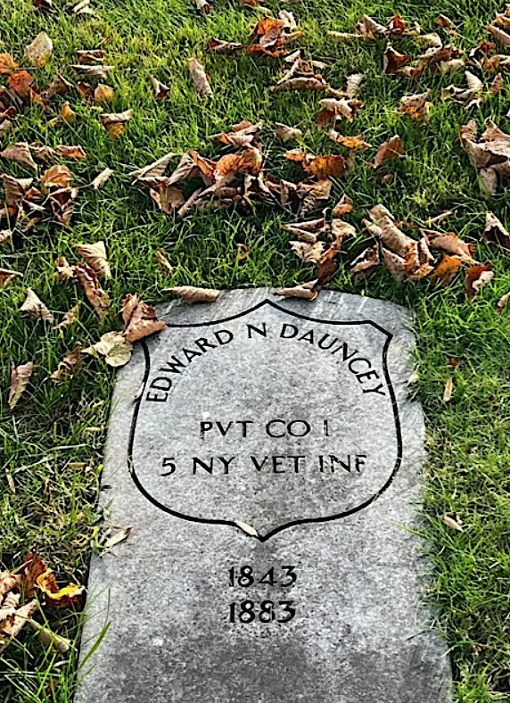 DAUNCEY, EDWARD (or EDWIN) N. (1842-1882). Private, 84th New York (14th Brooklyn) Infantry, Company B; 5th New York Veteran Infantry, Company I. A Brooklynite by birth, Dauncey enlisted there as a private on May 18, 1861, and mustered into the 14th Brooklyn five days later. Records show that he was arrested on March 8, 1864, at Alexandria, Virginia, was transferred into the 5th Veterans on June 2, 1864, and mustered out on August 21, 1865, at Hart’s Island, New York Harbor. At the time of muster out, he was absent and still under arrest. According to the 1880 census, he was employed as a real estate agent. At the time of his death, he was in the Brooklyn Penitentiary. Section 80, lot 463, grave 45.