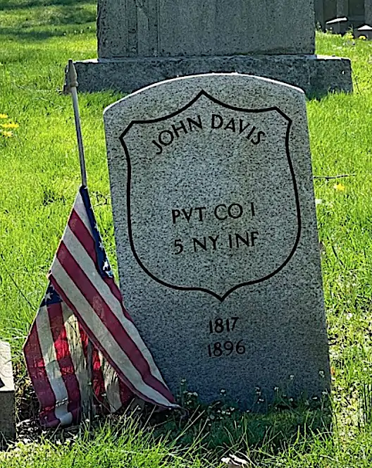 DAVIS, JOHN (1817-1896). Private, 5th New York Infantry, Company I. Born in England, he was a farmer when he enlisted at New York City at age 44 on April 25, 1861. Davis was 5′ 7¾” tall with hazel eyes and dark hair. He mustered into the 5th on May 9, and was discharged for disability after being treated for exposure on April 22, 1862, at Fort Monroe, Virginia. He last lived at 627 Warren Street in Brooklyn. His cause of death was attributed to old age. Section 97, lot 10494.