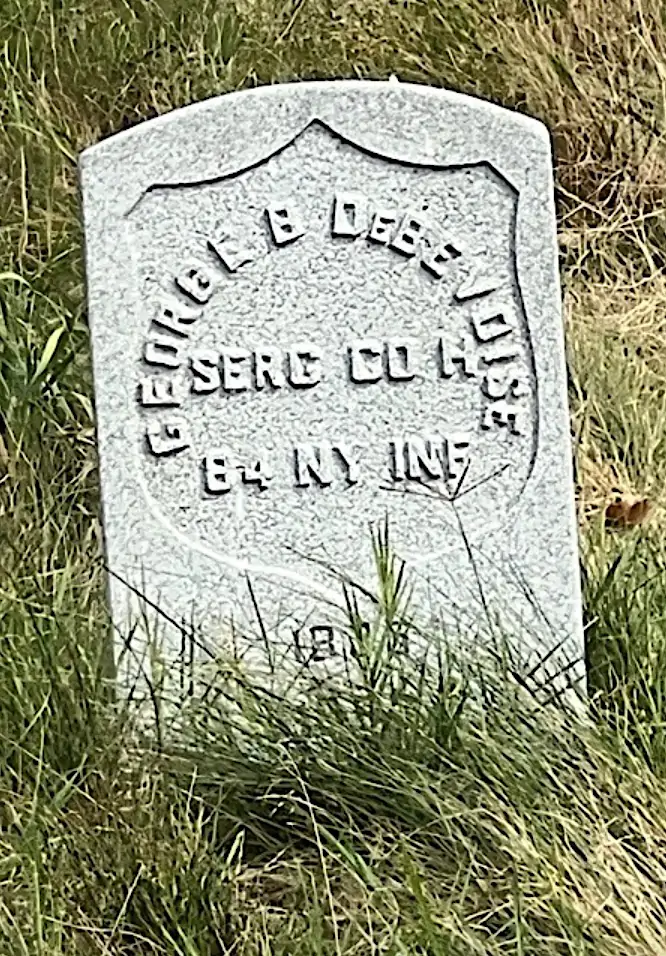 DeBEVOISE, GEORGE BUNEFORD (1835-1862). Sergeant, 84th New York (14th Brooklyn) Infantry, Company H. A New York City native, he married Henrietta Hunt in 1857; they had one son. DeBevoise is listed as a painter in the 1858 Brooklyn Directory who lived at 40 Clermont Avenue. After enlisting at Brooklyn as a corporal on April 18, 1861, he mustered into the 14th Brooklyn on May 23, and was promoted to sergeant on July 1, 1861. According to his muster roll, DeBevoise was a painter by trade. He died of typhoid fever on June 14, 1862, at General Hospital, Washington, D.C. The shipment of his body, back from the front, was recorded on the Bodies in Transit list. The 1862 Brooklyn Directory notes that he lived at 75 Adelphi Street. On April 28, 1863, Henrietta DeBevoise applied for and received a widow’s pension, certificate 18,462. On November 16, 1865, a minor’s claim for a pension was granted under certificate 95,438. He and William DeBevoise (see) were brothers. Section 114, lot 8999, grave 974.