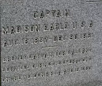 EARLE, MADISON (or MATTHEW) (1837-1880). Captain by brevet; first lieutenant, 12th Infantry, United States Army, Company G. Earle, who was born in New York, was the son of Major John Earle, a veteran of the War of 1812. He was a lawyer as per the New York City Directory of 1857 and the census of 1860 (which also notes that his personal estate was valued at $400).