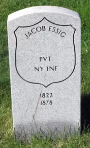 ECKSTEIN, MICHAEL (1843-1879). Private, 68th New York Infantry, Company A. A native of Bavaria, he enlisted as a private at New York City on December 1, 1863, and mustered into the 68th New York, also known as the 2nd German Rifles, the same day. Serving in the Washington, D.C., area until the spring of 1862, the regiment was then ordered to the Mountain Department and became part of Fremont’s forces. He served the remainder of the War and mustered out on November 30, 1865, at Fort Pulaski, Georgia. According to the 1870 census, he was a tailor by trade. His last residence was at 210 Forsyth Street in Manhattan. Eckstein died of Bright’s disease. Isabella Eckstein, his widow, applied for and received a pension in 1890, certificate 348,011. Section 15, lot 17263, grave 2477.