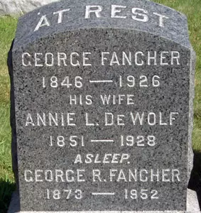 FANCHER, GEORGE (1846-1926). Private, 51st New York Infantry, Company B. Born in New Canaan, Connecticut, he enlisted at Brooklyn on March 7, 1865, mustered into the 51st New York that day, and mustered out on July 7 of that year at Alexandria, Virginia. He was a member of General McQuade Post #557 of the G.A.R. In 1909, he applied for and received an invalid pension, certificate 1,155,546. He last lived at 297 Kosciusko Street in Brooklyn. He died of a cardiac condition. Annie L. Fancher, who is interred with him, applied for and received a widow’s pension in 1926, certificate a5-3-27. Section 199, lot 28453.