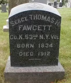 FAWCETT, THOMAS (1834-1912). Sergeant, 53rd New York Infantry, Companies C and K. . A native of Manhattan, Fawcett enlisted on September 18, 1861, as a sergeant, and mustered into Company C of the 53rd New York the next day. As per his muster roll, he was employed as a clerk, stood 5′ 7″ tall, and had grey eyes, dark hair and a dark complexion. On October 22, 1861, he transferred to Company K. He mustered out on March 21, 1862, at Washington, D.C.