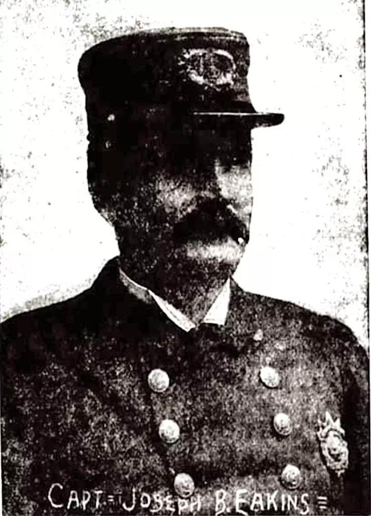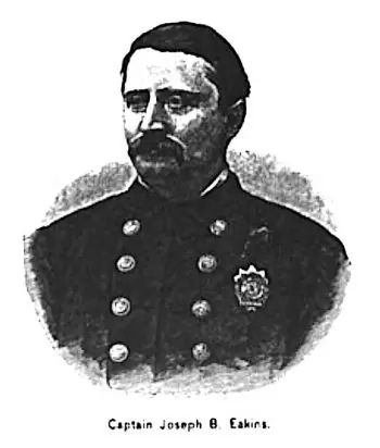 Eakins was appointed to the police force in New York City on March 1, 1866, made roundsman on December 6, 1868, sergeant on March 21, 1872, and was promoted to captain on October 19, 1876. His biography in Our Police Protectors described Eakins as a modest man who was popular, energetic and held in high esteem by his superiors. The New York City Directory for 1876 lists him as a policeman. At the time he mustered into Lafayette Post #140 of the G.A.R. on July 7, 1893, he lived in New York City and was employed as a police captain. On December 6, 1893, the New York Herald reported that Eakins was one of 13 police captains who were assigned to different precincts for “the good of the service”; Eakins was moved from Delancey Street to Mercer Street in Manhattan (there was no mention of wrong-doing by Eakins in the article). In 1907, his application for a soldier’s pension was approved, certificate 1,132,724. He last lived at 261 Irving Street in Brooklyn. His death was attributed to myocarditis. Eliza Jane Eakins, who is interred with him, applied for and received a widow’s pension in 1908, certificate 664,258. Section 33, lot 22778.