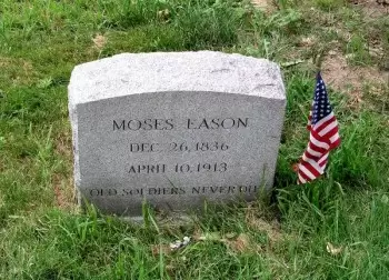 EASON, MOSES (1836-1913). Private, 82nd New York Infantry, Companies A and E. Eason, who was originally from Ireland, came to the United States when he was 20 years old. According to the census of 1860, he was a plasterer by trade. He enlisted and mustered into Company A of the 82nd New York on June 16, 1861, at New York City, and was transferred to Company E on July 15. After being injured and taken prisoner on June 30, 1862, at White Oak Swamp, Virginia, he was paroled on an unstated date, and discharged for disability at Hammond Hospital, Point Lookout, Maryland, on January 5, 1863.