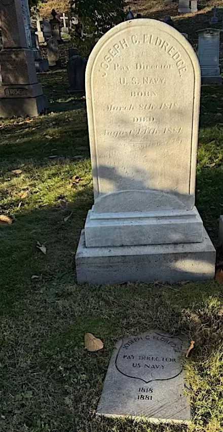 During the Civil War, Eldredge was on the Lancaster, a steam-sloop in the Pacific Squadron from 1862-63, and spent part of that time assigned to New York for special duty. According to one biography, he was paymaster of the Pacific fleet during the Civil War. He was paymaster at New York from 1866-69. Eldredge was promoted to pay director on March 3, 1871, and retired from service on March 8, 1880. He was likely the father of Charles Eldredge (see). His last residence was at 49 Cambridge Place in Brooklyn. His death was caused by apoplexy. Section 94, lot 10517.
