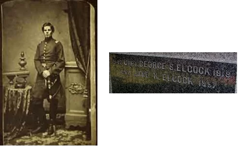 ELCOCK, GEORGE SHARP (or SHARPE) (1843-1918). Captain, 84th New York (14th Brooklyn) Infantry, Company E. A New York native, he was 5′ 8″ tall with grey eyes and light hair. At the onset of the Civil War, Elcock enlisted at Brooklyn on April 18, 1861, was commissioned into the 14th on May 23 as a second lieutenant, and was promoted to first lieutenant on August 4, 1861. On November 14, 1861, his actions at Upton’s Hill, Virginia, were recognized when the members of Company E presented him with a ceremonial sword and silk sash with a gold belt as symbols of their esteem. He rose to captain on February 22, 1862 (but was not commissioned).