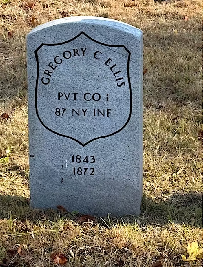 ECCLES, WILLIAM (1825-1873). Corporal, 139th New York Infantry, Company F. Of Irish birth, Eccles enlisted as a private at Brooklyn on August 30, 1862, mustered into the 139th New York on September 9, and was promoted to corporal of his company on November 15. He mustered out on June 19, 1865, at Richmond, Virginia. His last residence was 30 Fleet Street in Brooklyn. His death was caused by pneumonia. Section 17, lot 17245, grave 774.