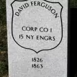 FERGUSON, DAVID (1826-1863). Corporal, 15th New York Engineers, Company I. Corporal, 15th New York Engineers, Company I. Ferguson, who was born in Scotland, married Margaret Flemming in 1850. During the Civil War, he enlisted at New York City as a private on May 9, 1861, and mustered into the 15th New York on June 17 for a term of two years. As per his muster roll, he worked in civilian life as a rigger and was 5′ 8″ tall with blue eyes, brown hair and a ruddy complexion. On November 1, 1862, he was promoted to corporal. Ferguson was hospitalized at Armory Square Hospital in Washington, D.C., in April 1863.