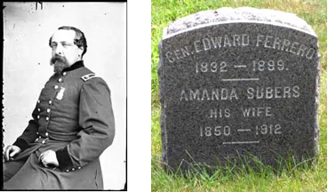 In the last campaign of the War, including the siege of Petersburg, Virginia, Ferrero commanded the “colored division” of the 9th Corps. As this siege dragged on, a plan was hatched for coal miners from the 48th Pennsylvania to tunnel underneath the Confederate lines and to detonate a massive explosion to breach those lines. While the coal miners worked for one month to dig their 600-foot tunnel, Ferrero’s troops were trained to spearhead the assault. However, on the day before the detonation, the troops of Brigadier General James H. Ledlie were ordered to precede Ferrero’s men in storming through the expected gap in the Confederate line. On July 30, 1864, four tons of powder were successfully detonated, and nine companies of South Carolinians were blown high into the air. Nevertheless, both Ledlie’s and Ferrero’s men charged to disaster, running into The Crater which the explosion left instead of forming around it. While these men committed this fatal mistake, Ledlie, joined by Ferrero, sat in a bombproof oblivious to the plight of their commands, and “passed a bottle of rum back and forth.” Southern troops reformed on the rim of The Crater, shooting down trapped Union men, and many black troops were shot even after they surrendered. One Union officer said, “The men were dropping thick and fast, most of them shot through the head. Every man that was shot rolled down the steep sides to the bottom, and in places they were piled up three and four deep. Bayoneted muskets, which had been abandoned on the field earlier, were picked up by the Confederates and flung, like javelins, into the pit. Heavy canister fire from a Confederate battery swept Union soldiers who somehow had managed to scramble to the crest of the Crater A court of inquiry found that Ferrero, Ledlie, and their commander General Ambrose Burnside, were primarily responsible for this disaster, but Ferrero avoided formal punishment, and despite the incident was brevetted major general in December 1864. Ferrero mustered out of service on August 24, 1865, and returned to New York, where he managed several large ballrooms until the end of his life. His last residence was on West 78th Street in Manhattan. He died from pneumonia. Amanda Ferrero, who is interred with him, applied for and received a widow’s pension, certificate 673,787. Section 76, lot 4317, grave 2.