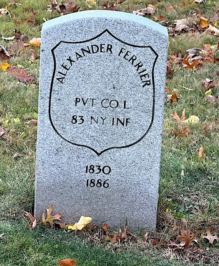 FERRIER, ALEXANDER (1830-1886). Private, 83rd New York Infantry, Company L. A native New Yorker, Ferrier’s occupation on the census of 1860 was “porter and ale.” During the Civil War, he enlisted at New York City on September 6, 1861, and mustered into the 83rd New York on that day. During his service, he was listed as a deserter on September 15, 1862, at Thoroughfare Gap, Virginia, and surrendered at an unstated place on March 10, 1865. He mustered out on May 13, 1865, at Fort Columbus in New York Harbor.