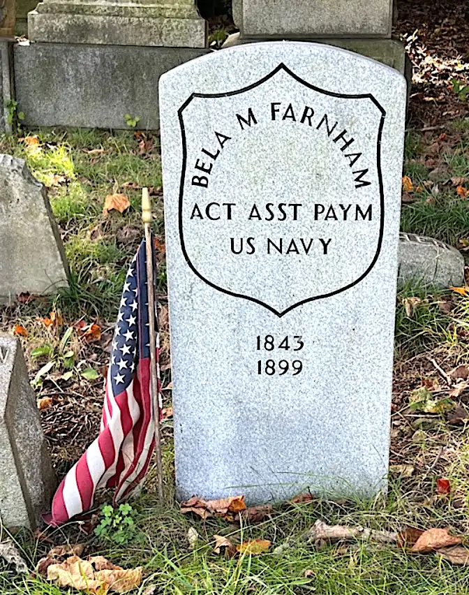 Farnum’s name was mentioned in an unusual article in Harrisburg, Pennsylvania’s Patriot on December 23, 1879. According to that article, a cemetery plot at Green-Wood was used as collateral and then sold to Farnum who in turn sold it to another party. The original owner had buried two of his children in that lot, did not want them disinterred, and argued that once the lot is used it cannot be taken away without the owner’s knowledge or permission; the decision was reversed in the original owner’s favor. The Veterans Schedule of 1890 confirms his Navy service. In 1890, he received a pension from the United States Navy, certificate 18,323. He also was brevetted lieutenant colonel and colonel of New York Volunteers but there are no details for these honors.