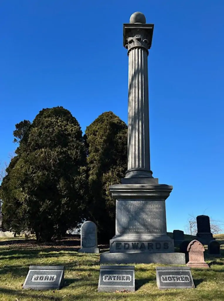 The 1868 Jersey City Directory lists Edwards as a bookkeeper. The 1870 census and the 1872 Jersey City Directory note that he lived in Jersey City, New Jersey, and worked as a clerk. According to the 1880 census, he was living in Newark, New Jersey, with his wife and children and working as a bookkeeper. He was the brother-in-law of William E. Olssen (see). As per his obituary in the New York Herald, he was an employee of the Broadway Insurance Company in New York City. His obituary in the New York Sun notes that his funeral was held at the Reformed Church in Woodside, New Jersey, where he last lived. Section 101, lot 4436.