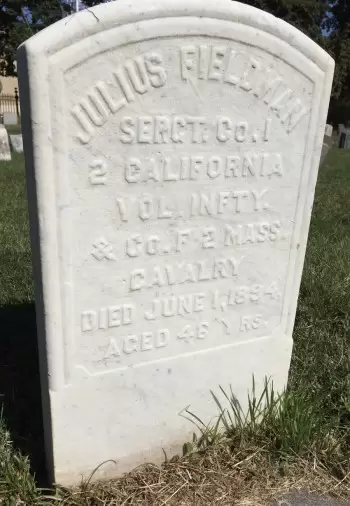 FIELDMAN (or FELDMANN), JULIUS C. (also enlisted as MILLER, JULIUS) (1840-1894). Sergeant, 2nd California Infantry, Company I; 2nd Massachusetts Cavalry, Company F. Born in Hessen, Germany, and at one time a resident of California, he worked as a brass finisher. Using the alias Julius Miller, he enlisted as a corporal at San Francisco, California, on November 7, 1861, and mustered into the 2nd California Infantry. He was promoted to sergeant on January 9, 1862, was detached as escort to a pack train in July 1862, and reduced to ranks (private) on January 26, 1863. Fieldman deserted from Fort Gaston, California, on February 16, 1863. Subsequently, he surrendered to the 2nd Massachusetts under President Abraham Lincoln’s Proclamation, then in force on the Pacific coast, which allowed deserters to return to service and avoid punishment.