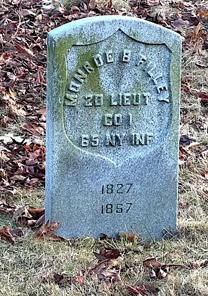 FILLEY, MONROE (or THOMAS) B. (1827-1867). Second lieutenant, 65th New York Infantry, Companies B and I; private, 67th New York Infantry, Companies A and B. According to the census of 1850, Monroe B. Filley was living in Hartford, Connecticut, his birthplace, and working there as a clerk. His initial enlistment in the Civil War is blurred by a confusing muster roll that includes both the names “Monroe B.” and “Thomas B.” Filley. That muster roll indicates that the recruit was a clerk from Hartford who was 5′ 9″ tall with blue eyes, light brown hair and a fair complexion. Further, he was a substitute for William A. Light who was drafted. According to that paperwork, Filley enlisted at the 5th Congressional District on June 18, 1864, mustered into Company A of the 67th New York Infantry that same date, transferred intra-regimentally on July 4 into Company B, and transferred into Company B of the 65th New York on September 1.