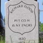FLOOD, RICHARD (1820-1874). Private, 15th New York Engineers, Company H. A native of Ireland, Flood enlisted as a private at New York City on June 7, 1861, and ten days later mustered into the 15th Engineers. Flood last lived in New York City at 553 West 36th Street. He died of congestion of the lungs. Section 15, lot 17263.
