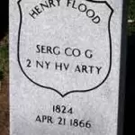 FLOOD, HENRY BARTON (1824-1866). Sergeant, 2nd New York Heavy Artillery, Company G. Sergeant, 2nd New York Heavy Artillery, Company G. Of Irish birth, Flood’s obituary in the New York Sun notes that he was the grandson of Reverend Henry Flood of Kilkenny, Ireland, an eloquent speaker and advocate of an independent Irish Parliament. During the Civil War, he enlisted at New York City as a corporal on October 5, 1861, and mustered in ten days later. As per his muster roll, he was 5′ 9″ tall with brown eyes, black hair and a dark complexion. Captain Henry Benson singled out Flood for distinguished conduct in his report from New Bridge, Virginia, on May 31, 1862, and on July 9 from Harrison’s Landing, Virginia, in describing the recent engagement at Malvern Hill in that state. He was reduced in rank to a private at some point but was reinstated as a corporal on July 1, 1863, and on November 1, 1863, was promoted to sergeant. On December 29, 1863, he re-enlisted and on January 1, 1864, his rank was reduced to private. According to his muster roll, he deserted on March 18, 1864, but a court-martial concluded that he was not guilty of desertion but was guilty of absence without leave. He was wounded in Petersburg, Virginia, on June 18, 1864. On September 29, 1865, he mustered out in Washington, D.C. He last lived in Flatbush, Brooklyn. He died from cancer of the liver and stomach. Margaret Flood applied for and was awarded a widow’s pension on October 22, 1866, certificate 127,597. Section 115, lot 13536 (Soldiers’ Lot), grave 106.