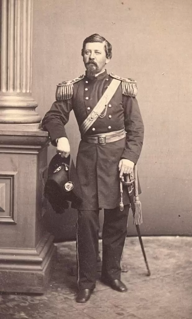 FRANK, PAUL (1828-1875). Brigadier general by brevet; colonel, 52nd New York Infantry; first lieutenant and adjutant, 5th Regiment, New York State Militia. Born in Saxony, Germany, on February 7, 1828, as Henry Paul Ferdinand Frank, he enlisted on April 19, 1861, at New York City, as a first lieutenant. On May 1, 1861, he was commissioned into the Field and Staff of the 5th New York State Militia as first lieutenant and adjutant and mustered out on August 7, 1861, at New York City. On October 25, 1861, he was promoted to colonel and was commissioned into the Field and Staff of the 52nd New York Infantry on November 1, the same day that his brother Emil (see) enlisted in that regiment. In the Peninsula Campaign in 1862, he was actively engaged in the Battles of Seven Pines and Fair Oaks (both in Virginia) and in all the battles and engagements during the seven days of fighting. William French praised him in his field report from Fair Oaks, Virginia, on June 3, 1862, for repulsing the enemy. Subsequently, Frank described the action at the Battle of Antietam, Maryland (September 17, 1862), in his report three days later: