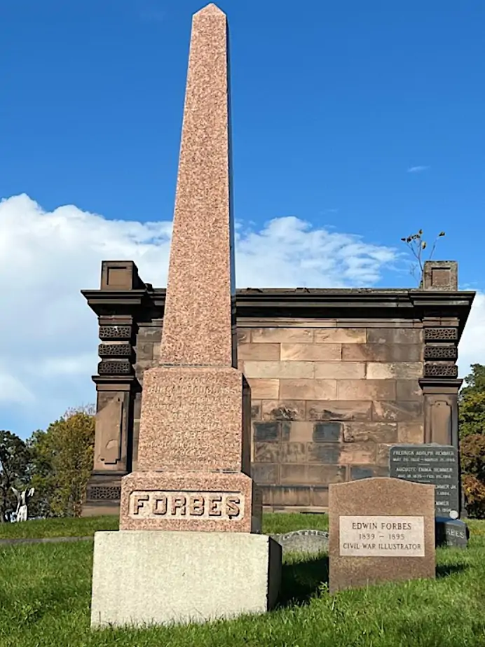 FORRESTER, JR., JAMES (1815-1871). Assistant surgeon, 15th Regiment, New York Engineers, Company S. A New Yorker by birth, Forrester enlisted and was commissioned as an assistant surgeon in the 15th on May 14, 1861, did not muster in, and was discharged on the same day. As per his obituary in the New York Herald, he was a member of several fraternal groups among them the Freemasons and the Knights of Templar. A physician, he last lived at 202 Bleecker Street in Manhattan. Forrester died from pneumonia. The inscription on his gravestone reads: “AND HE HATH PUT A NEW SONG IN MY MOUTH EVEN PRAISE UNTO OUR GOD.” Section 95, lot 2635.