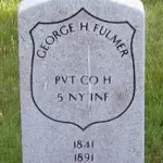 FULMER, GEORGE H. (1841-1891). Private, 5th New York Infantry, Company H. Fulmer enlisted at New York City, his birthplace, on July 9, 1861, and mustered into the 5th on that date. A clerk by trade, he was 5′ 10¼” with blue eyes and brown hair. On September 6, 1862, he was discharged for disability at Henry House, Virginia, after falling sick from exposure at Harrison’s Landing, Virginia, in July 1862. In 1890, his application for an invalid pension was approved, certificate 489,657. The Veterans Census of 1890 confirms his Civil War service and indicates that he was wounded in the left shoulder during the War. At that time, he was living in Rockaway, New Jersey. As per his obituary in the New York Herald, he was a Freemason. His death was attributed to paralysis. Shortly after his death in 1891, Mary Fulmer, who is interred with him, applied for and received a widow’s pension, certificate 334,047. Section 187, lot 20070.