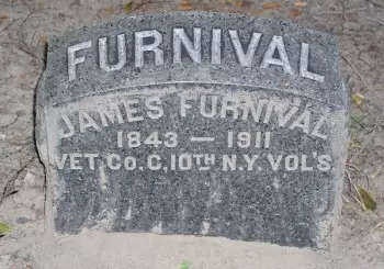 FURNIVAL, JAMES (1843-1911). Private, 10th New York Infantry, Company C. After enlisting at New York City on April 26, 1861, he mustered into the 10th four days later, and mustered out on May 7, 1863, at New York City. He was a mail carrier as per the Brooklyn Directory for 1888; the 1889 Brooklyn Directory lists him as a policeman. The 1890 Veterans Schedule confirms his Civil War service. Furnival received an invalid pension in 1892, certificate 1,118,839. The census for 1900 reports that Furnival was employed as a policeman. His last address was 506 11th Street in Brooklyn. He died of arteriosclerosis. Section 87, lot 1715, grave 92.
