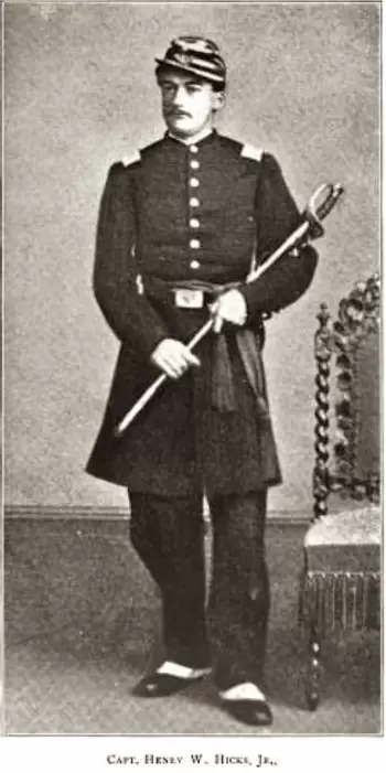 HICKS, JR., HENRY W . (or A.) (1839-1863). Captain, 165th New York Infantry, Company B; private, 7th Regiment, New York State National Guard, Company F. Of English birth, he enlisted at New York City as a private in 1861 and mustered into the 7th Regiment, one of the first units to take up arms. The 7th was at Washington, D.C., and later fought at the Battle of First Bull Run, Virginia, on July 21 before mustering out in August 1861. When the 7th Regiment was called up in 1862, Hicks re-enlisted on May 25, 1862, mustered into the 7th Regiment that day, and mustered out with his company after three months on September 5 at New York City. He re-enlisted at New York City as a captain on September 18, 1862, and was immediately commissioned into the 165th Infantry, part of the 2nd Duryée Zouaves. He was officially promoted to captain on December 3, 1862, with rank from September 18. Hicks wrote to his brother from Port Hudson, Louisiana, on June 11, 1863: